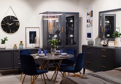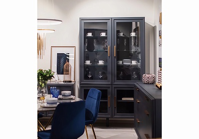 - Одна секция с рамочным фасадом, вставка — стекло. За дверью — 4 стеклополки;