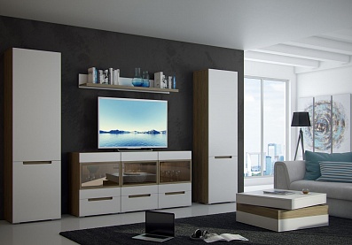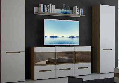 Корпус предметов интерьера изготовлен в теплом цвете «давос трюфель», который прекрасно сочетается с более светлым, бежевым покрытием фасадов. Матовые поверхности с эффектом бархата подарят приятные тактильные ощущения во время эксплуатации мебели. Замена традиционной фурнитуры на скрытые профильные ручки облегчает внешний вид комплекта, визуально делает его более воздушным и компактным.