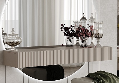 - Напольные тумбы выполнены с матовым тактильным эффектом из «серого кашемира»;