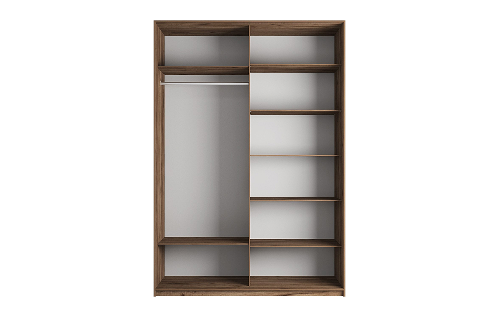 - За фасадами две одинаковых по размеру секции: одна с двумя полками и штангой, другая — с 5 полками;